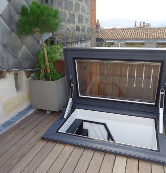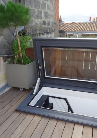 Beispiel eines Skydoors Beispiel eines Skydoors auf einer Dachterrasse über einer Wendeltreppe. Bild ansehen Produkt ansehen